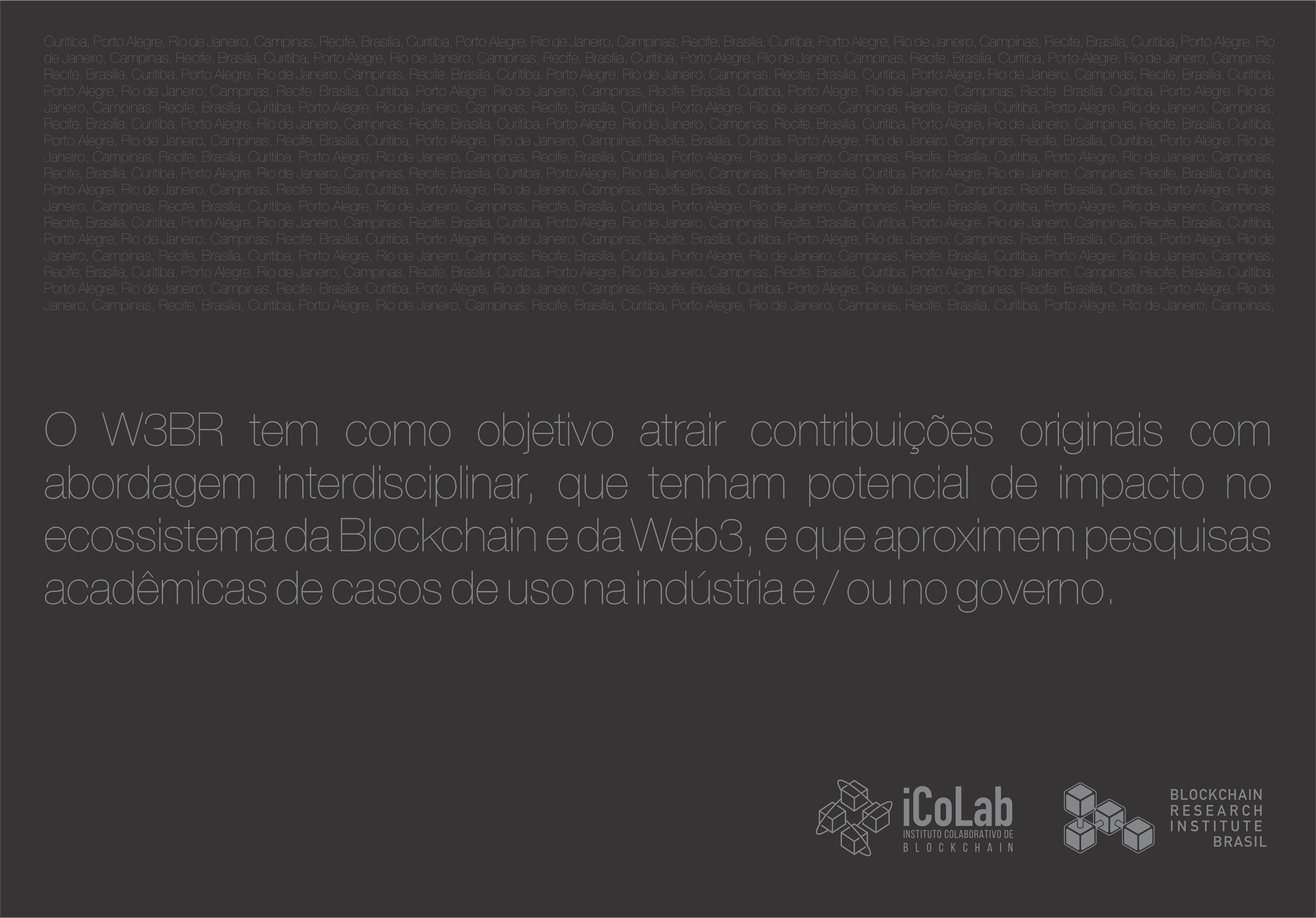 O W3BR tem como objetivo atrair contribuições originais com abordagem interdisciplinar, que tenham potencial de impacto no ecossistema da Blockchain e da Web3, e que aproximem pesquisas acadêmicas de casos de uso na indústria e / ou no governo.